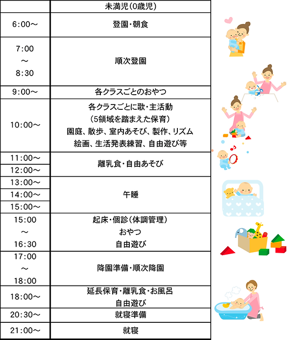 お子様の月齢に合わせてゆっくりと楽しい時間が流れていきます。また時間はあくまでも目安です。お子さまが安心して過ごせるよう月齢や季節に応じた生活時間に配慮しています。
